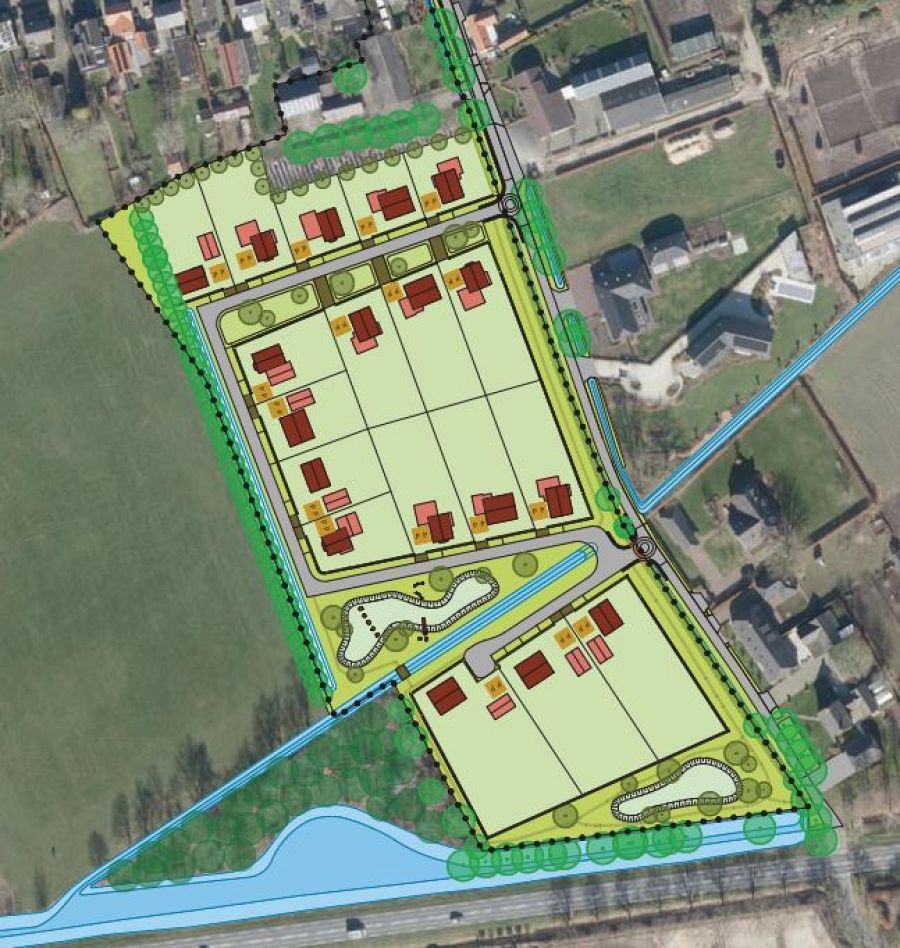 De bestaande waardevolle landschapselementen vormen de basis voor de ontwikkeling: zo blijft de struweelhaag van meidoorn aan de Groenendaal behouden en ontwikkelt de nieuwe buurt zich compleet achter deze natuurlijke erfafscheiding. De westzijde wordt gekenmerkt door een bestaande wilgenrij. Deze bomenrij blijft behouden en wordt vergezeld met een groenstrook en een watergang. Deze watergang loopt over in een wadi die in de driehoekige groenzone ligt. Hier is ook ruimte voor speelelementen.